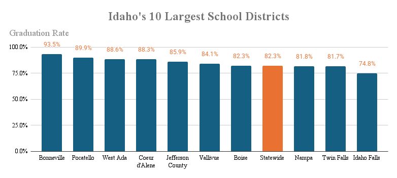 The state’s largest school districts had a wide variance in graduation rates, from 93% in Bonneville to 74.8% in Idaho Falls. Seven large districts outperformed the state average while three were below the benchmark, the same mix as last year.